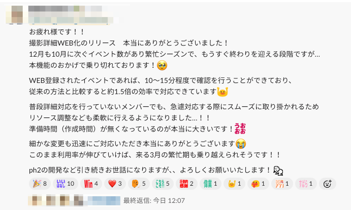 またこの定例mtgはシステムの要件整理だけでなく、運用者自身がリリース後にこの機能をどう使っていくべきなのかを十分に理解してもらう効果もありました。 おかげ様でリリース後に使い方がわからないといった問題も起きずスムーズに利用開始できたと思います。