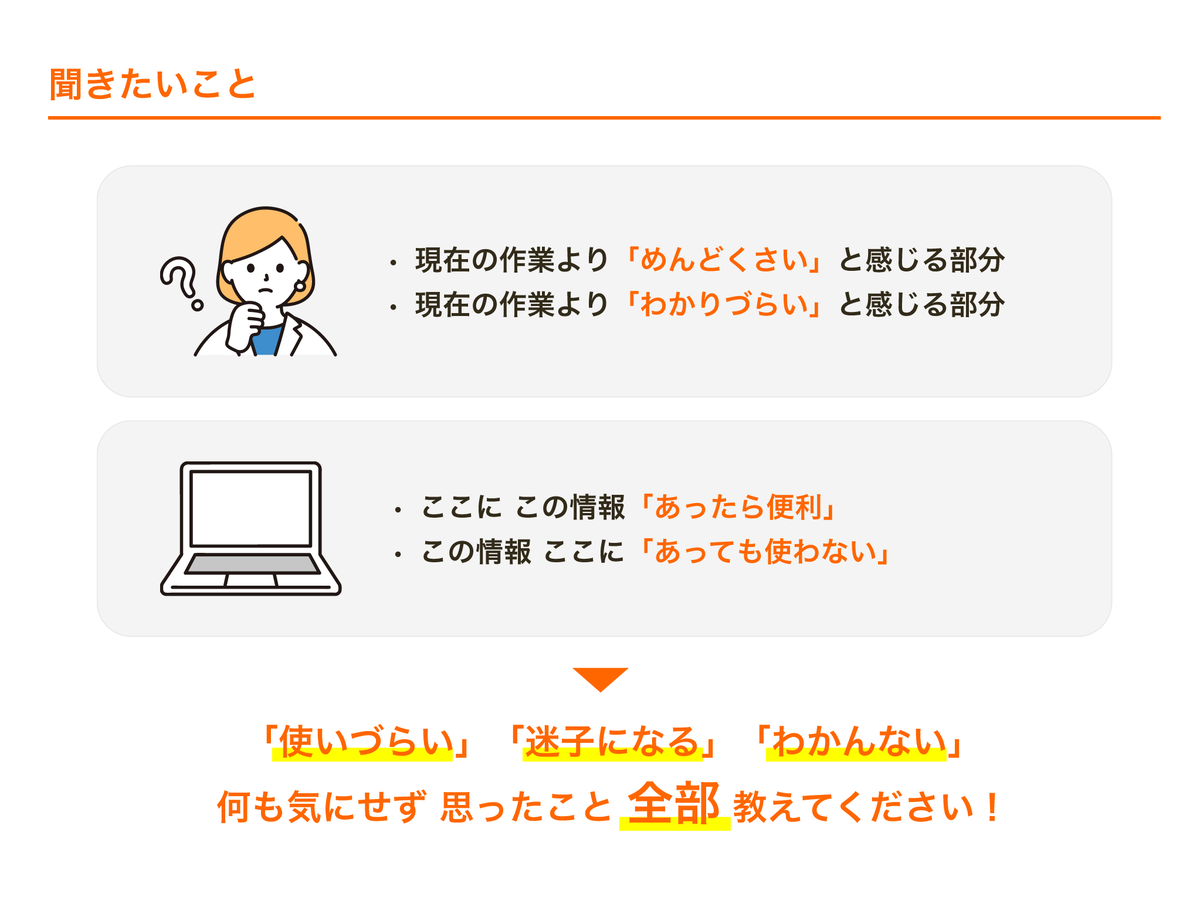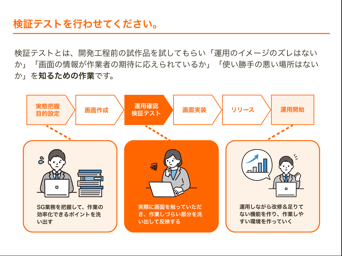 ユーザビリティテストとは別に運用者との定例mtgを週2回以上実施し運用フローのユースケースを細かく洗い出していきました。 最終的に60件以上の運用者からの質問と40ケース以上のユースケースを1つずつ確認しシステム破綻している部分がないか確認しました。