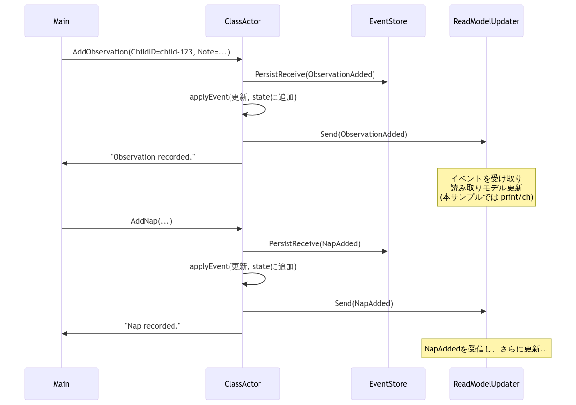 - Commandが来る → Eventを永続化 → Stateを更新 → ReplyToへイベント転送