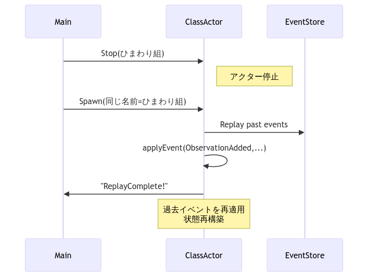 - PersistReceiveで保存しておいたイベントが、再起動時にReplayCompleteイベントを介して再適用され、クラスアクターの状態を復元できる。