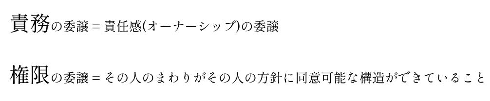 - 権限の移譲 = その人が決定を行い、まわりがその人の方針に 「同意可能な構造」ができていること